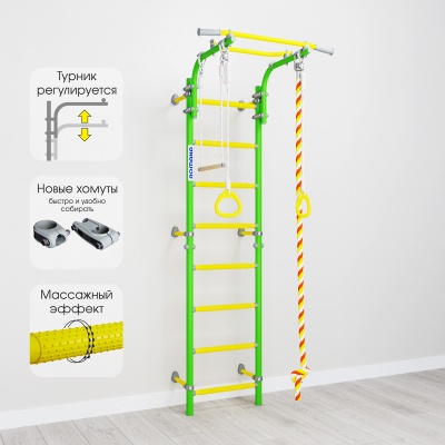 Высота турника регулируется и фиксируется надежными хомутами. Комфортно заниматься смогут пользователи разного роста. На ступени нанесено массажное покрытие, что способствует развитию моторики и профилактике плоскостопия у ребенка. Комплект снабжен кольцами, трапецией и канатом, так что диапазон упражнений возможных к выполнению достаточно широк. Детский спортивный комплекс ROMANA Next Top - настоящий хит в линейке шведских стенок. Он легко собирается и фиксируется к стене с помощью подвижных крепежей.