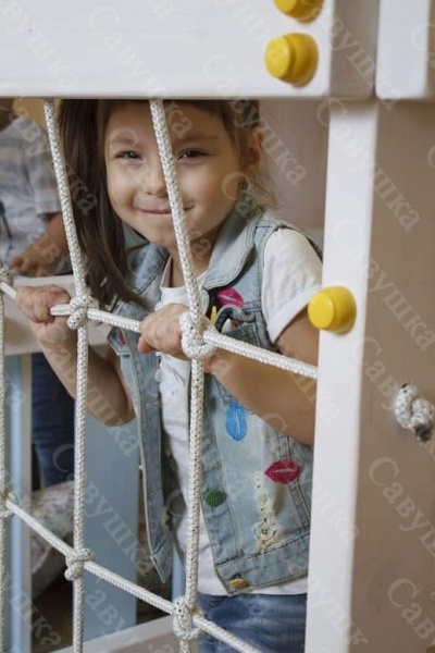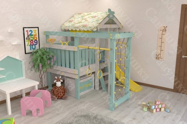 Трансформация комплекса безгранична. В один момент комплекс может превратится из зоны активных игр в уютный домик, из уютного домика в пиратский корабль и из корабля в уютное спальное месте для отдыха от активных игр. Благодаря высокой платформе под комплексом-кроватью Савушка Baby спокойно размещаются ящики с любимыми игрушками. Возможен выбор покраски комплекса.