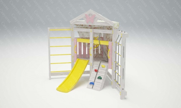 В базовой комплектации детский комплекс представлен без покрытия. При желании есть возможность заказать выкраску детского игрового комплекса в один из 5 цветовых решений (без покраски, голубой, розовый, оливковый, серый, желтый).