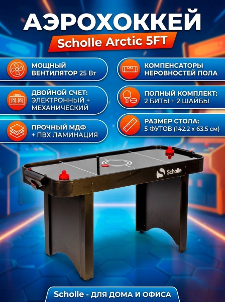 Стол для аэрохоккея Scholle Arctic 5FT - ОписаниеСомневаетесь? - Посмотрите рейтинг ТОП-10 по категории «Аэрохоккей»Данная модель предназначена для использования в условиях дома и офиса, идеально подойдет для начинающих пользователей. Корпус, ножки и игровое поле выполнены из МДФ. Компенсаторы неровности пола позволяют выровнять стол даже при установке на неровную поверхность и устранить качение.