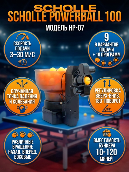 Робот для настольного тенниса Scholle PowerBall 100 - ОписаниеНастольный робот-тренажер Powerball 100 - Тренажер для настольного тенниса HP-07 используется как начинающими, так и профессиональными спортсменами для тренировки каждый день.