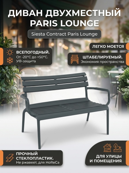 Диван Siesta Contract Paris Lounge двухместный - ОписаниеШтабелируемый двухместный диван Paris Lounge изготавливается из полипропилена, упрочненного стекловолокном, полученным с использованием новейшего поколения технологий формования пластмасс под давлением. Модель с нескользящими ножками прекрасно подходит для использования внутри и снаружи помещений. В коллекцию Paris также входят большой кофейный столик и маленький боковой столик, который может служить подставкой для ног, идеально соответствующей стилю силуэта дивана.