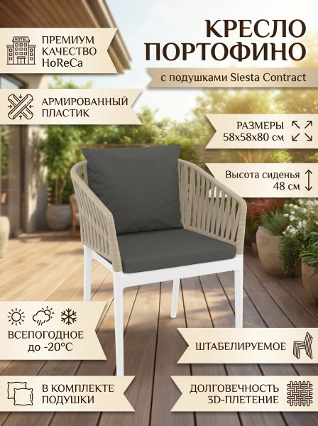 Кресло пластиковое с подушками Siesta Contract Portofino, белый, бежевый, тёмно-серый - ОписаниеКресло Portofino от турецкой фабрики Siesta Contract представляет собой стильное и надежное решение для уличного использования в сферах HoReCa и Contract. Выполненное из высококачественного полипропилена, армированного стекловолокном, кресло отличается исключительной прочностью и устойчивостью к воздействию внешней среды. Благодаря новейшим технологиям формования пластмасс под давлением, материал кресла устойчив к выцветанию и деформации, а нескользящие ножки обеспечивают безопасность и стабильность как внутри помещений, так и на улице. Особый акцент сделан на обволакивающей спинке, плавно переходящей в подлокотники, с 3D-эффектом плетения из плоского роупа, что придает креслу современный вид и визуально напоминает натуральное плетение, сохраняя при этом преимущества пластика.