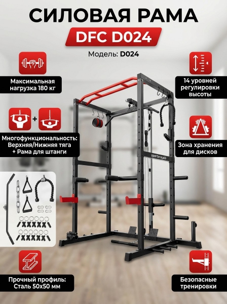 Силовая рама для штанги DFC D024 - ОписаниеСомневаетесь? - Посмотрите рейтинг ТОП-10 по категории «Силовые рамы»Силовая рама многофункциональная D024 — надежный домашний тренажёр для проработки всех основных групп мышц. Конструкция изготовлена из прочного стального профиля, что обеспечивает высокую устойчивость и долговечность при интенсивных нагрузках.