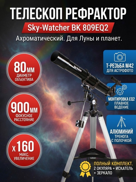 Телескоп рефракторный Sky-Watcher BK 809EQ2 - ОписаниеАхроматический рефрактор BK 809EQ2 хорошо подойдет в качестве первого телескопа. Эта модель оптимизирована для наблюдения за Луной, планетами и другими объектами ближнего космоса. Оптика высокого качества формирует контрастное и четкое изображение.
