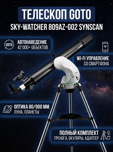 Телескоп Sky-Watcher 809AZ-GO2 SynScan GOTO - ОписаниеТелескоп Sky-Watcher 809AZ-GO2 SynScan GOTO – это рефрактор-ахромат, дополненный компьютеризованной азимутальной монтировкой AZ-GO2 SynScan GOTO с системой автонаведения, эффективную работу с которой могут вести как новички, так и профессионалы. В комплект поставки уже входят самые необходимые аксессуары для наблюдений, позволяющие начинать эксплуатацию телескопа из коробки: диагональное зеркало 90°, искатель с красной точкой, два окуляра PHOTO 10 мм и 20 мм и удобный адаптер для смартфона.