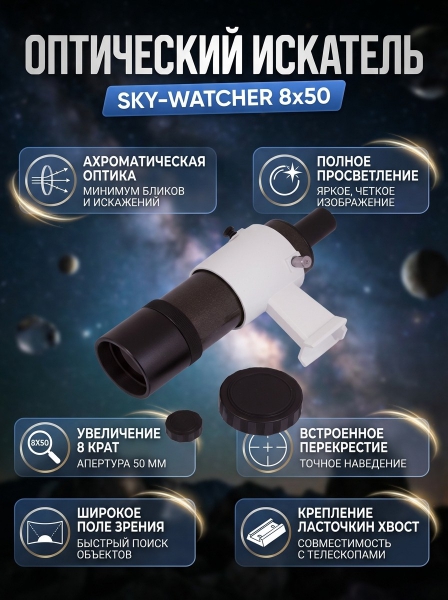 Искатель оптический Sky-Watcher 8x50 с креплением - ОписаниеАхроматический искатель Sky-Watcher 8x50 применяется для поиска небесных тел и предварительного наведения на объекты. Полностью просветленная оптика формирует картинку высокого качества. Широкое поле зрения позволяет охватить взглядом большое пространство.