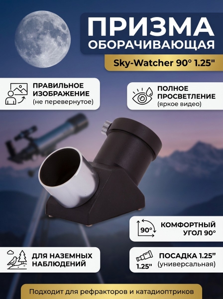 Призма оборачивающая Sky-Watcher 90° 1.25” - ОписаниеОборачивающая призма Sky-Watcher используется с рефракторами и катадиоптриками. За счет нескольких внутренних отражений призма позволяет получить прямое – неперевернутое и не зеркальное – изображение в окуляре. Благодаря излому оптической оси на 90° смотреть в телескоп гораздо удобнее. Призма будет полезна при наблюдениях за наземными объектами и небесными телами, которые находятся высоко над горизонтом.