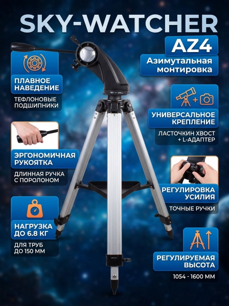 Монтировка Sky-Watcher AZ4 с алюминиевой треногой - ОписаниеSky-Watcher AZ4 – это азимутальная полувилочная монтировка, предназначенная для перемещения трубы телескопа во время визуальных наблюдений. Данная модель отличается небольшим весом, что особенно важно при транспортировке. Благодаря простому управлению эта монтировка подойдет даже начинающим любителям астрономии.