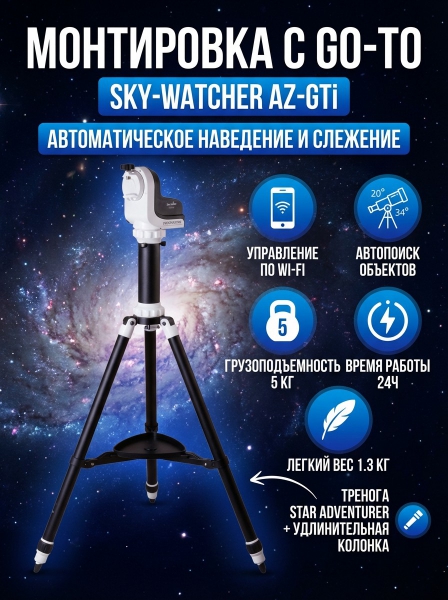 Монтировка Sky-Watcher AZ-GTi на треноге Star Adventurer - ОписаниеАзимутальная монтировка Sky-Watcher AZ-GTi на треноге Star Adventurer – отличный выбор для наземных наблюдений, изучения астрономических объектов и астрофотографии. Она подойдет для визуальных наблюдений за Луной и планетами Солнечной системы и панорамной съемки ландшафтов и объектов дальнего космоса. Простота конструкции и управления позволят использовать эту монтировку даже тем, кто не имеет опыта в изучении космоса.