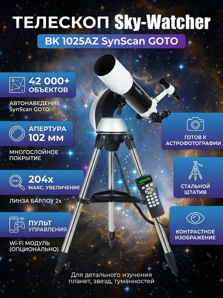 Телескоп-рефрактор Sky-Watcher BK 1025 c монтировкой AZ SynScan GOTO и комплектом основных оптических аксессуаров – это высокотехнологичный инструмент для ведения обзорных наблюдений за космосом, для подробного изучения космических объектов (звезд, планет, туманностей, спутников и т. д.), при наличии дополнительного оборудования – для занятия астрофотографией. В зависимости от используемого окуляра степень увеличения телескопа в базовой комплектации может составлять 25х или 50х, при установке линзы Барлоу – усиливаться еще в два раза, а максимально возможная потенциальная кратность устройства составляет 204х. Апертура Sky-Watcher BK 1025 – 102 мм, фокусное расстояние – 500 мм. Линзы в объективе телескопа имеют полное многослойное покрытие, помогающее формировать стабильно светлую, четкую и детализированную картинку наблюдаемого звездного неба.