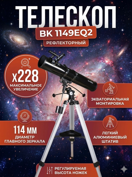 Телескоп рефлекторный Sky-Watcher BK 1149EQ2 - ОписаниеТелескоп BK 1149EQ2 – это высококачественный рефлектор Ньютона для первого знакомства с дальним космосом. С помощью этого телескопа можно увидеть десятки галактик, туманностей, звездных скоплений и многое другое. Оптическая труба устанавливается на жесткую экваториальную монтировку EQ2.