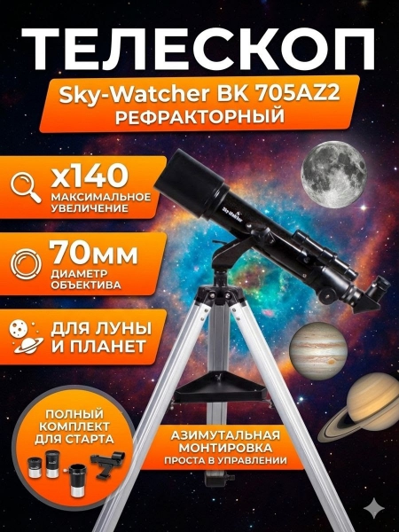 Телескоп на штативе Sky-Watcher BK 705AZ2 - ОписаниеТелескоп Sky-Watcher BK 705AZ2 – компактный рефрактор-ахромат на азимутальной монтировке. Он хорошо подойдет для наблюдений за Луной и объектами Солнечной системы. Небольшой телескоп удобно брать с собой в поездки, поэтому он хорошо подойдет для загородных наблюдений.