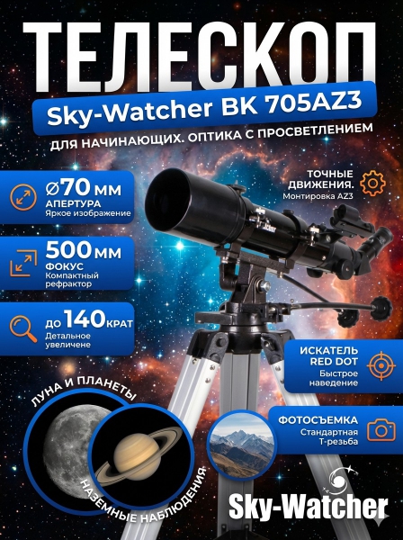 Телескоп рефракторный Sky-Watcher BK 705AZ3 - ОписаниеРефрактор-ахромат BK 705AZ3 – хороший выбор для наблюдений планет Солнечной системы и наземных объектов. На оптические поверхности нанесено просветляющее покрытие – картинка получается чистой и четкой по всему полю зрения. Легкий и компактный телескоп хорошо подойдет для загородных наблюдений. Благодаря простому управлению прибор быстро освоит даже начинающий.