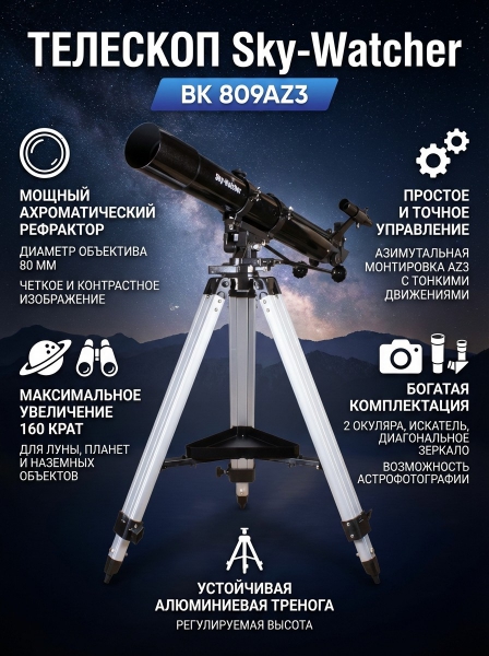 Телескоп рефракторный Sky-Watcher BK 809AZ3 - ОписаниеТелескоп BK 809AZ3 – это ахроматический рефрактор для наблюдений за объектами Солнечной системы и наземными объектами. Благодаря просветленной оптике изображение получается контрастным, с высокой детализацией. Управлять телескопом очень просто, поэтому он подойдет начинающим астрономам.