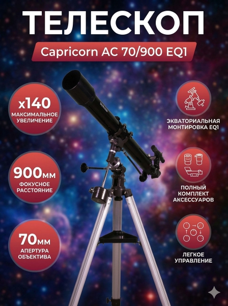 Телескоп на штативе Sky-Watcher Capricorn AC 70/900 EQ1 - ОписаниеSky-Watcher Capricorn AC 70/900 EQ1 – ахроматический рефрактор для наблюдения ближнего космоса и наземных объектов. Этим телескопом очень легко управлять, он не требует сложной настройки и юстировки, поэтому понравится начинающим астрономам.