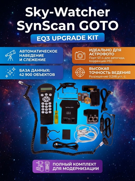 Комплект Sky-Watcher для модернизации монтировки EQ3 (SynScan GOTO) телескопа - ОписаниеКомплект Sky-Watcher для модернизации монтировки EQ3 – это простой способ усовершенствовать телескоп. Система SynScan позволяет значительно сократить время на поиск небесных тел и наведение. Кроме того, управлять телескопом будет гораздо проще – в комплект входит удобный пульт.