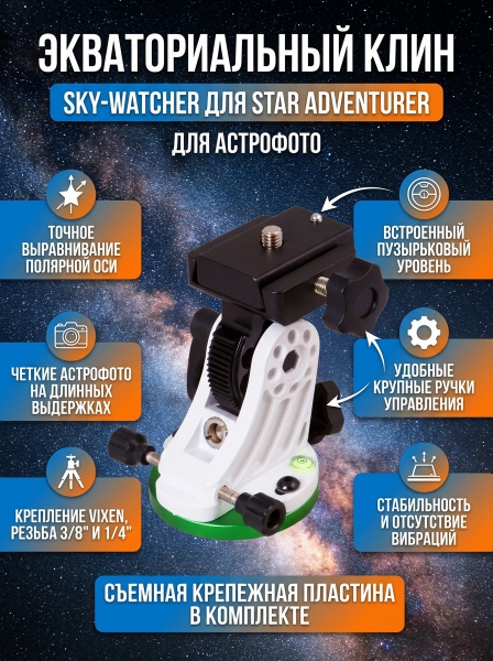 Клин экваториальный Sky-Watcher для монтировки Star Adventurer зеленый - ОписаниеЭкваториальный клин Sky-Watcher – аксессуар, который разработан для монтировок Star Adventurer и служит для выравнивания полярной оси телескопа по земной оси. Он избавляет от «вращения поля», благодаря чему появляется возможность заниматься астрофотографией на длинных выдержках. Клин можно устанавливать на любые треноги или фотоштативы, для фиксирования монтировки применяется съемная пластина с крепежным винтом (в комплекте).