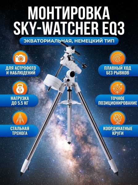 Монтировка для телескопа Sky-Watcher EQ3 со стальной треногой - ДоставкаДоставка по Москве: бесплатно, 1-2 дняДоставка по Санкт-Петербургу: бесплатно, 2-3 дня Доставка по России: стоимость уточняйте у оператора. Монтировка для телескопа Sky-Watcher EQ3 со стальной треногой - Отзывы0.0
