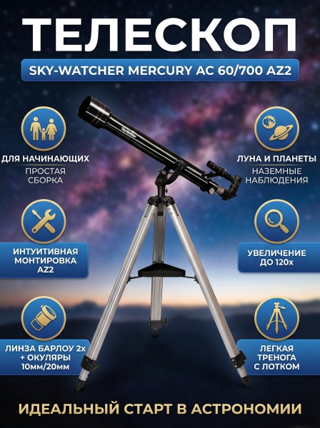Телескоп на штативе Sky-Watcher Mercury AC 60/700 AZ2 - ОписаниеSky-Watcher Mercury AC 60/700 AZ2 – телескоп для начинающих астрономов, взрослых и детей. Он прост в управлении, не требует первичной настройки и регулярной юстировки, прекрасно подходит для наблюдения Луны, планет земной группы и наземных объектов. В него также можно увидеть дальние области Солнечной системы, но без деталей.