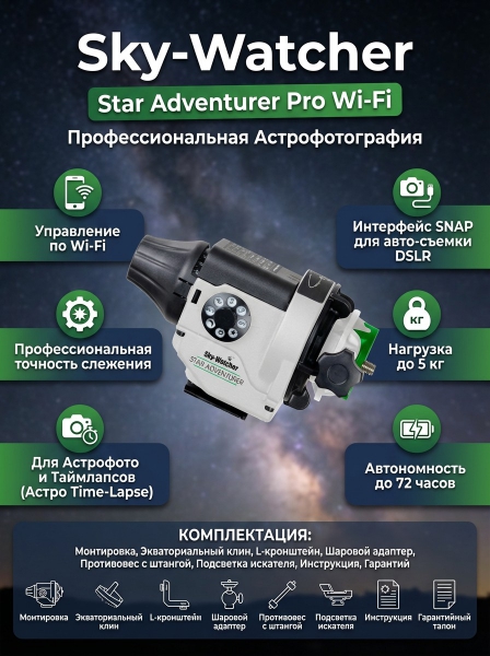 Монтировка Sky-Watcher Star Adventurer Pro Wi-Fi, бело-зеленая - ОписаниеМонтировка Sky-Watcher Star Adventurer Pro Wi-Fi – это компактный инструмент, который был создан специально для занятия астрофотографией и съемки таймлапсов. Его физический механизм и внутренние программные алгоритмы идеально подходят для эффективного фиксирования самых захватывающих небесных тел и областей космоса: сервопривод, отвечающий за движения монтировки, обеспечивает плавное перемещение ее подвижных частей без рывков, лишних вибраций и люфтов, а запрограммированные скорости для долгой покадровой съемки (2, 4 и 12 часов) помогут астроному без труда создавать впечатляющие фото- и видеоматериалы со звездным небом. Монтировка может сопровождать объекты на лунной, звездной или солнечной скоростях. Есть порт для подключения автогида.