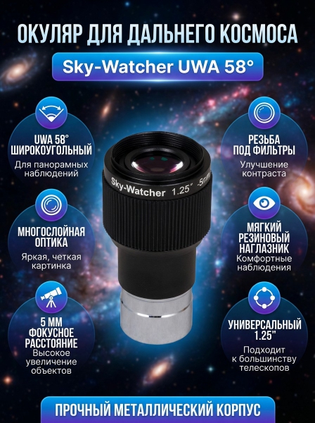 Окуляр Sky-Watcher UWA 58° 5 мм 1.25” - ОписаниеШирокоугольный окуляр Sky-Watcher UWA 58° с фокусным расстоянием 5 мм позволит расширить возможности вашего телескопа. Эта модель имеет широкое поле зрения и идеально подходит для наблюдения галактик, звездных скоплений и других протяженных небесных тел. Высококачественная оптика формирует четкую и чистую картинку.