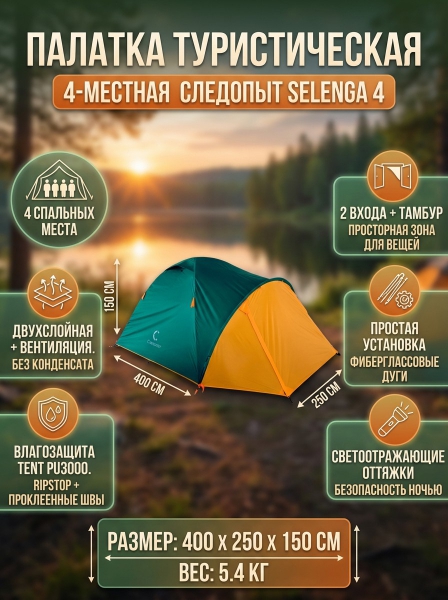 Палатка летняя двухслойная Следопыт Selenga 4 - ОписаниеПалатка Следопыт Selenga 4-х местная двухслойная с двумя входами. Высокопрочная конструкция состоит из двух слоев. Тент изготовлен из Ripstop 190T PU3000, защищающий от дождя и ветра. Москитная сетка предотвращает проникновение насекомых. Не смотря на прочность материала, в палатке всегда будет присутствовать свежий воздух, благодаря системе вентиляции купола. Палатка Следопыт Селенга рассчитана на летний период.