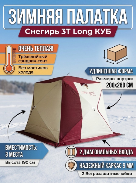 Зимняя палатка Снегирь 3T Long рассчитана на троих человек. Модель имеет форму вытянутого куба, поэтому внутри больше места, чем у «купола». В сложенном виде изделие довольно габаритное и не подходит для длительной ручной переноски.
