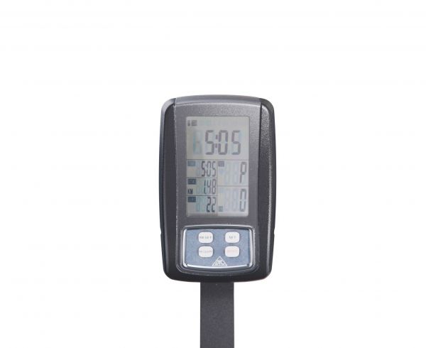 Монохромный дисплей отображает такие параметры как время, скорость, дистанция, калории, количество оборотов в минуту и пульс. Есть целевой режим и режим восстановления.