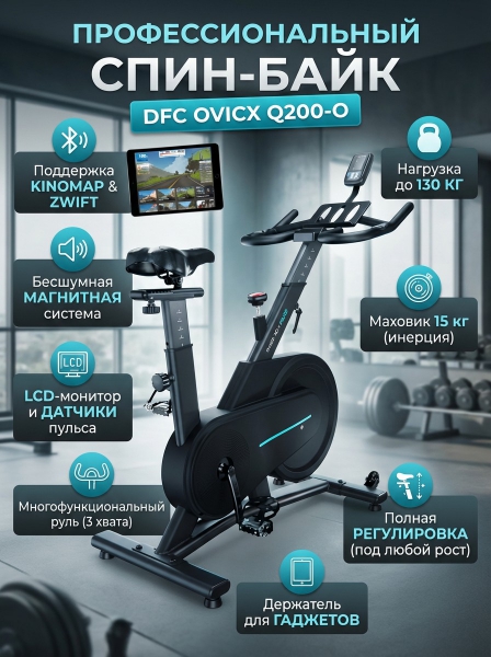 Велотренажер DFC DFC OVICX Q200-O - ОписаниеСомневаетесь? - Посмотрите рейтинг ТОП-10 по категории «Велотренажеры»Спин-байк DFC OVICX Q200-O — отличный вариант для тех, кто желает проводить качественные кардио-тренировки прямо у себя дома, имитируя катание на настоящем велосипеде. Уникальный объединенный руль с тремя видами хвата (Bullhorn, Butterfly и Aero) и покрытием, устойчивым к скольжению и поту, гарантирует удобство и безопасность в процессе тренировки.