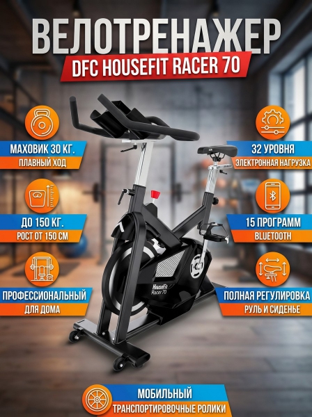 Велотренажер DFC HOUSEFIT RACER 70 - ОписаниеСомневаетесь? - Посмотрите рейтинг ТОП-10 по категории «Велотренажеры»Спин-байк HouseFit RACER 70 для домашнего использования — это современный тренажер кардио, который идеально подойдёт для регулярных домашних тренировок. Благодаря своей универсальности и расширенной системе настроек, он эффективно заменит занятия в фитнес-зале.