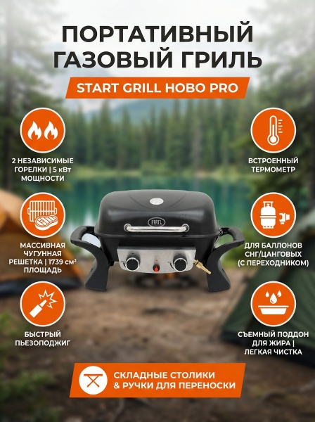 Портативный газовый гриль Start Grill HOBO-PRO 2 горелки - ОписаниеHOBO PRO – мобильный переносной гриль, успешно совмещающий расширенные функциональные возможности! Модель можно совместить со складной подставкой (приобретается отдельно), и получить отличный вариант стационарного гриля, удобного в перемещении и хранении.