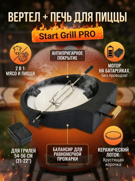 Вертел для гриля Start Grill KS-AS-RK-21 PRO (печь для пиццы+ вертел) - ОписаниеБлагодаря мощному мотору вертел способен проворачивать большие куски мяса и обеспечивать равномерное приготовление. Основание вертела имеет специальную форму, которая позволяет плотно закрывать крышку керамического гриля.