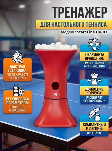 Тренажер для настольного тенниса Start Line HP3 - ОписаниеРобот-тренажер для настольного тенниса HP-03 предназначен для ежедневных тренировок и отработки приемов мяча. Подходит для начинающих игроков, а также может быть использован в качестве спарринг-партнера профессиональными спортсменами.