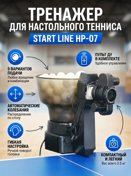 Тренажер для настольного тенниса Start Line HP-07 - ОписаниеТренажер для настольного тенниса HP-07 предназначен для ежедневных тренировок как для начинающих игроков, так и для профессиональных спортсменов. Тренажер может подавать мячи с отскоком как от ближней, так и от дальней половины стола.