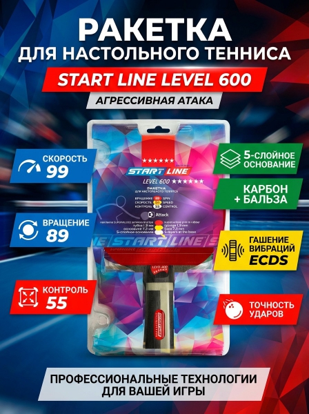Ракетка для настольного тенниса Start Line Level 600 прямая - ОписаниеРакетка для настольного тенниса Level 600 соответствует высокому современному стандарту качества, имеет обновленный дизайн, а также улучшенные технологические и игровые характеристики. В производстве ракеток Level 600 применены новейшие технологии. Технология натяжения - TR. Tension Il Technologу. Благодаря применению модифицированных полимерных материалов здесь технология натяжения доведена до совершенства. При игре резина хорошо поглощает атакующие удары мячей, улучшены внутренняя энергия резины и губки. Ракетка Level 600 отличается высокой скоростью и хорошим вращением. Технология амортизации - ECDS: EVA Clustered Damping System. Данная система представляет собой дополнительный резиновый слой, заложенный в конструкции ручки до основания ракетки. Применение этой технологии несет функцию сбора энергии и снижения вибрации, обеспечивает хороший контроль игры. Технология снижения веса -Balsa Super Light. Эта технология работает на уменьшение веса ракетки для получения экстремально быстрой скорости касания мяча. Технология дерева - BalsaCARBO Technology. Технология содержания двух слоев из бальзы и карбона, придает ракетке высокую скорость, эластичность и легкость. Технология поглощения - Gecko Adsorption Technologу. Эту технологию применяют при производстве резиновой поверхности ракетки. Так, на самой поверхности резины образуется множество выходных отверстие (как губка), которые позволяют задержать мяч на резине. Благодаря этой технологии можно свободно контролировать мяч, его скорость и вращение. Технология симметрии - Symmetrical Microcellular Foam Technologу. Благодаря применению симметричного мелкопористого пенопласта, ракетка отличается эластичностью, легкостью и хорошим энергопоглощением.