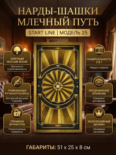 Нарды-шашки Start Line «Млечный путь 25» - ОписаниеДанная модель относится к категории элитного товара и предназначена для настоящих ценителей не только игры в нарды и шашки, но и внешнего содержания.