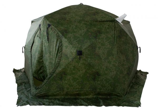 Конструкция имеет вывод под печную трубу, что дает дополнительные возможности для обогрева в холодное время года. Также есть москитная сетка, а значит, палатка подойдет и для летних походов.