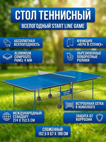 Стол теннисный с сеткой Start Line Game всепогодный синий - БрендStart Line – это известный во всем мире производитель оборудования для здоровья и спорта, каждый экземпляр которого сопровождается гарантией качества.