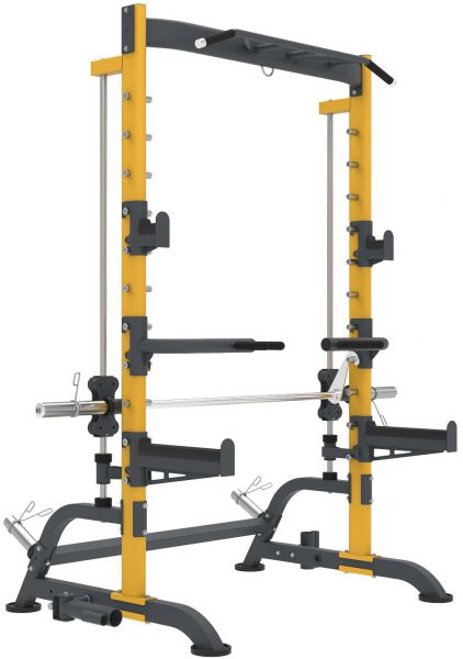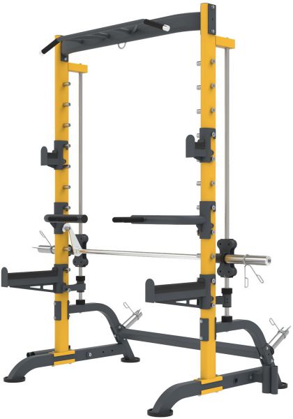 Машина Смита представляет собой силовой тренажёр с прочной стальной рамой, выполненной в жёлто-чёрной цветовой гамме. Конструкция имеет устойчивую П-образную форму и оснащена двумя основными вертикальными направляющими, по которым перемещается фиксированный гриф. По всей высоте стоек расположено множество уровней фиксации, позволяющих точно настраивать рабочую высоту штанги под различные упражнения и рост пользователя.
