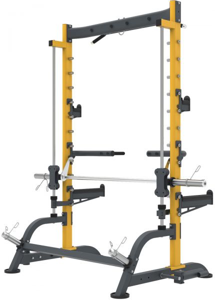 Тренажёр оборудован грифом для приседаний, который движется строго по заданной траектории и фиксируется с помощью ограничительных кронштейнов безопасности, размещённых сверху вниз на стойках. Это обеспечивает дополнительную защиту при выполнении упражнений со свободными весами. Конструкция также дополнена боковыми упорами и держателями, расширяющими функциональные возможности тренажёра.