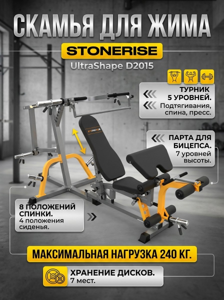 Скамья с опциями Stonerise UltraShape D2015 - ОписаниеСомневаетесь? - Посмотрите рейтинг ТОП-10 по категории «Универсальные скамьи»Скамья с опциями Stonerise D2015 UltraShape предназначена для развития мышц всего тела благодаря большому количеству снарядов, поставляющихся в комплекте. Сиденье регулируется на 4 уровня по углу наклона, спинка – на 8 уровней. Турник регулируется по высоте на 5 уровней. Парта для бицепса регулируется по высоте на 7 уровней. Доступно 2 посадочных места для хранения дисков.