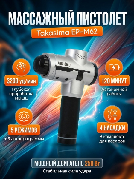 Массажный пистолет Takasima ЕР-М62 - ОписаниеСомневаетесь? - Посмотрите рейтинг ТОП-10 по категории «Массажеры»Вибромассажер для тела «Массажный пистолет» Takasima EP-M62 единственный в своем роде ударный многофункциональный, постукивающий и поколачивающий массажер. При регулярном применении боль и напряжение уходят, а на смену приходит расслабление и комфорт!