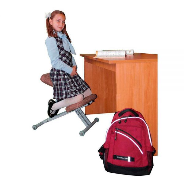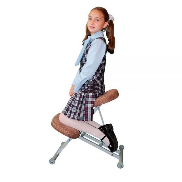 Сиденье стула находится в положении под углом 25 градусов уменьшает нагрузку на поясничный отдел. Спина без усилий находится в правильном положении. Удобная подставка в области колен не позволяет сидеть в асимметричных позах , «нога на ногу» — наиболее опасных для формирующегося позвоночника.