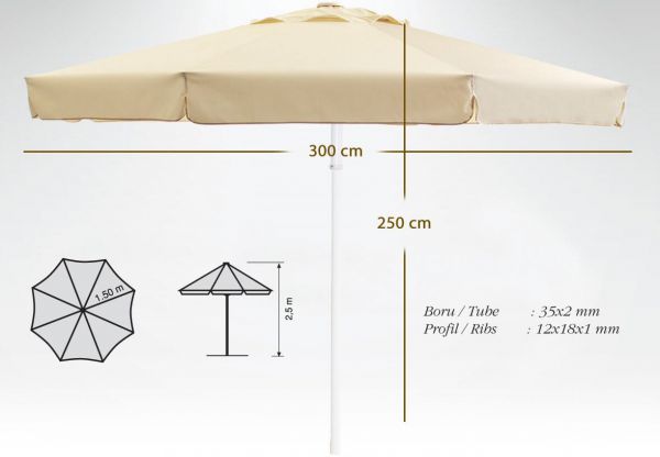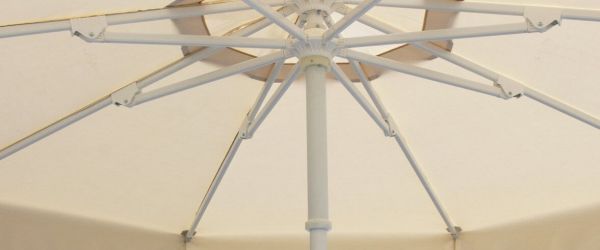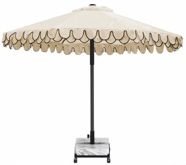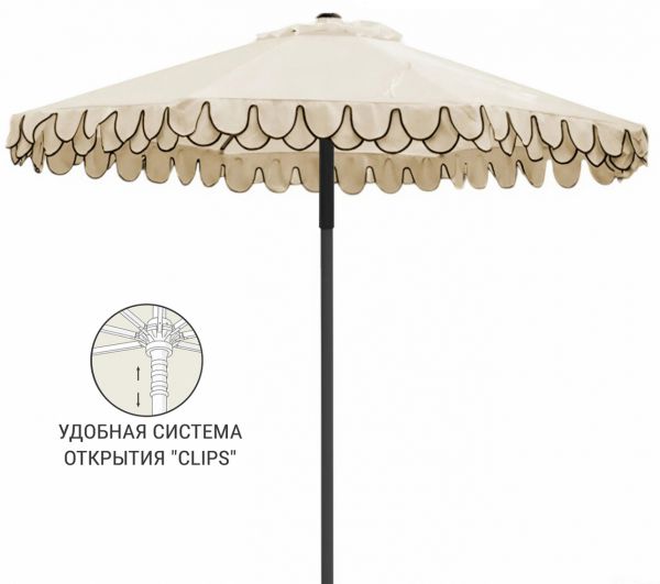 Особенности: Алюминиевая центральная опора Ø50 мм и толщиной стенки 2 мм. Алюминий окрашен и прошел специальную термообработку, которая повышает прочность и коррозионную стойкость зонта. 8 алюминиевых спиц 20х30 мм, толщиной стенки 2 мм. Детали выполнены из цельного пластика. Купол выполнен из акрила 2926 (natural) с фигурным двойным воланом с черным кантом. Дополнительно можно приобрести утяжелительную базу на колесах весом 70 кг.