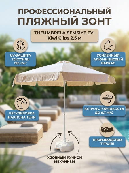 Зонт пляжный профессиональный THEUMBRELA SEMSIYE EVI Kiwi Clips Ø2,5 м - ОписаниеKiwi Clips - профессиональный зонт с центральной опорой из алюминия, что обеспечивает высокую устойчивость модели. Он защитит от ярких солнечных лучей и создаст приятную затененную атмосферу в частных садах, открытых летних площадках кафе, баров и ресторанов, зоны возле бассейна.