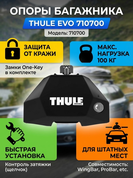 Упоры Thule Evo 710700 со штатными местами - ОписаниеПростая в установке опора для багажника Thule Evo, предназначенная для автомобилей с интегрированными местами для установки, Т-профилем или дополнительно установленными точками крепления багажника. Фиксируется на автомобиле с помощью замков системы Thule One-Key (входят в комплект).