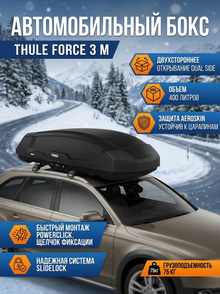Бокс Thule Force 3 M, черный, dual side, aeroskin, 400 л - ОписаниеБокс Thule Force 3 предназначен для активной семьи, предлагая надежное решение для круглогодичного использования. Независимо от того, отправляетесь ли вы на приключения на выходные или нуждаетесь в дополнительном месте для хранения в повседневной жизни, этот багажник обеспечивает надежную работу. Доступный в различных размерах, чтобы соответствовать разнообразным транспортным средствам и образам жизни, его прочная поверхность AeroSkin выдерживает ежедневные нагрузки, обеспечивая долговечность и функциональность.