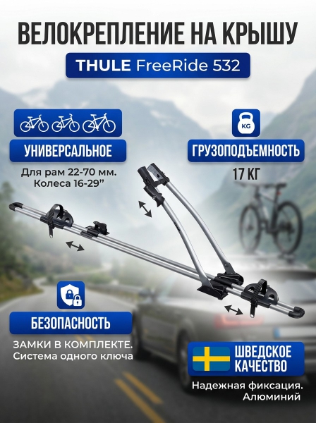 Вертикальное велосипедное крепление Thule FreeRide 532 - ОписаниеПростое и функциональное крепление для велосипеда. Вертикальное велосипедное крепление Thule FreeRide 532 предназначено для перевозки велосипеда на крыше автомобиля. Основным преимуществом данной модели является максимально легкий и быстрый монтаж на дуги с помощью универсальных зажимов. Задний зажим закрывается на ключ для предотвращения возможности снятия велокрепления посторонними. Велокрепление рассчитано на перевозку 1-го велосипеда. В комплект данной модели также входят Т-образные переходники 20х20 мм, обеспечивающие удобство установки на дуги Thule (WingBar, SquareBar, SlideBar). Крепление для автобагажника Thule FreeRide 532 позволяет перевозить велосипед с рамой 22–70 мм и любым диаметром колеса. Жесткая фиксация за раму осуществляется при помощи удобного и надежного зажима с замком. Для его запирания и отпирания используется тот же самый ключ, что и самого крепления. Мягкие накладки на внутренней стороне зажима предотвращают повреждение рамы велосипеда. Колеса в креплении фиксируются при помощи гибких ремней.