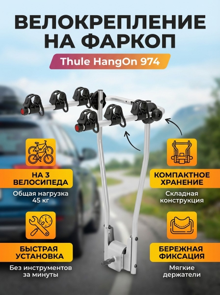 Крепление на фаркоп Thule HangOn для 3-х велосипедов (без функции наклона) - ОписаниеКрепление на фаркоп Thule HangOn 974 позволяет перевозить одновременно до 3-х велосипедов общим весом до 45 кг. Данная модель не оснащена функцией наклона, позволяющей открывать заднюю дверь автомобиля без снятия велосипедов, но при этом отличается легкой, компактной и надежной конструкцией, а также простотой установки и более доступной ценой. В сложенном состоянии это велокрепление легко помещается в багажнике, а его монтаж занимает всего несколько минут. Преимуществом велокрепления Thule HangOn 974 является универсальность конструкции, которая позволяет установить его без предварительной регулировки. Фиксация крепления на фаркопе осуществляется при помощи специального накидного ключа, входящего в комплект. При необходимости обеспечить защиту от несанкционированного снятия на крепежный элемент можно установить специальный замок Thule Lock 957 (приобретается отдельно). Велосипеды в данном случае крепятся за верхнюю раму при помощи удобных мягких держателей. В случае необходимости перевозки женских или иных велосипедов без верхней рамы, необходимо дополнительно приобрести специальный переходник Thule Bike Frame Adapter.